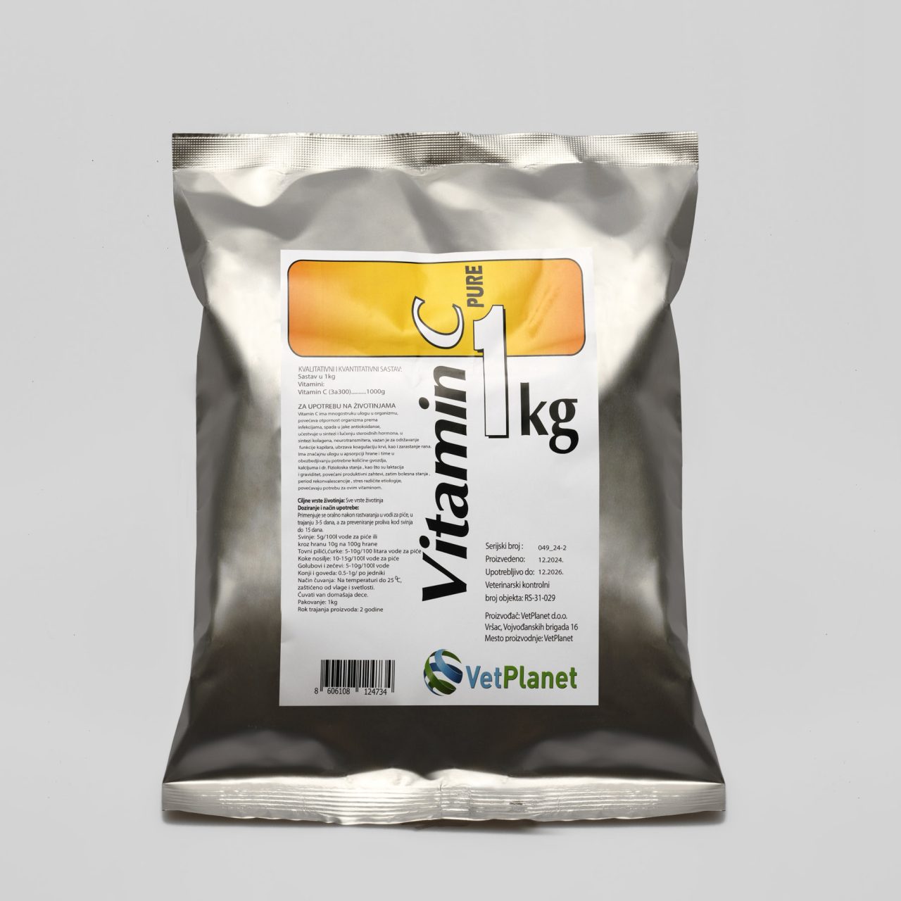 USE: Vitamin C is the strongest antioxidant among vitamins and has many roles in the organism: reductant agent in living organisms, important role in feed absorption (calcium, iron, folic acid), production of collagen, production and synthesis of steroid hormones – anti-inflammatory effect and treatment of functional sterility, synthesis of neurotransmitters , involved in carbohydrate metabolism, improves the physiological state of blood vessels, supports normal capillary function, increases the resistance towards infections, speeds up the blood coagulation and is essential for wound healing. Stress, greater physical labor, contagious diseases, gestation and lactation increase the need of this vitamin.