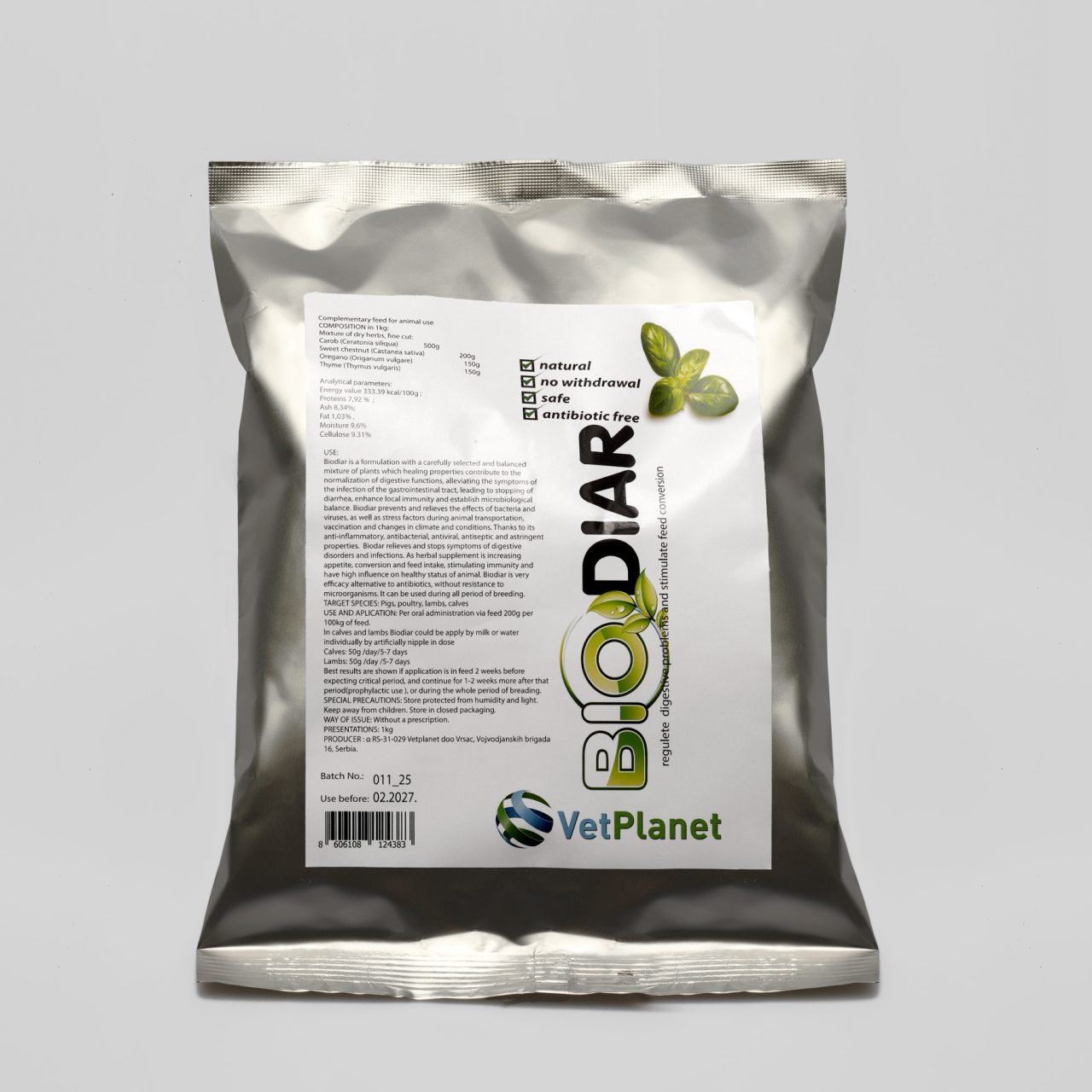 DESCRIPTION: Biodiar is a formulation with a carefully selected and balanced mixture of plants which healing properties contribute to the normalization of digestive functions, alleviating the symptoms of the infection of the gastrointestinal tract, leads to stopping of diarrhea, enhance local immunity and establish microbiological balance. Biodiar prevents and relieves the effects of bacteria and viruses, as well as stress factors during animal transportation, vaccination and changes in climate and conditions. As herbal supplement is increasing appetite, conversion and feed intake, stimulating immunity and have high influence on healthy status of animal. It can be used during all period of breeding.